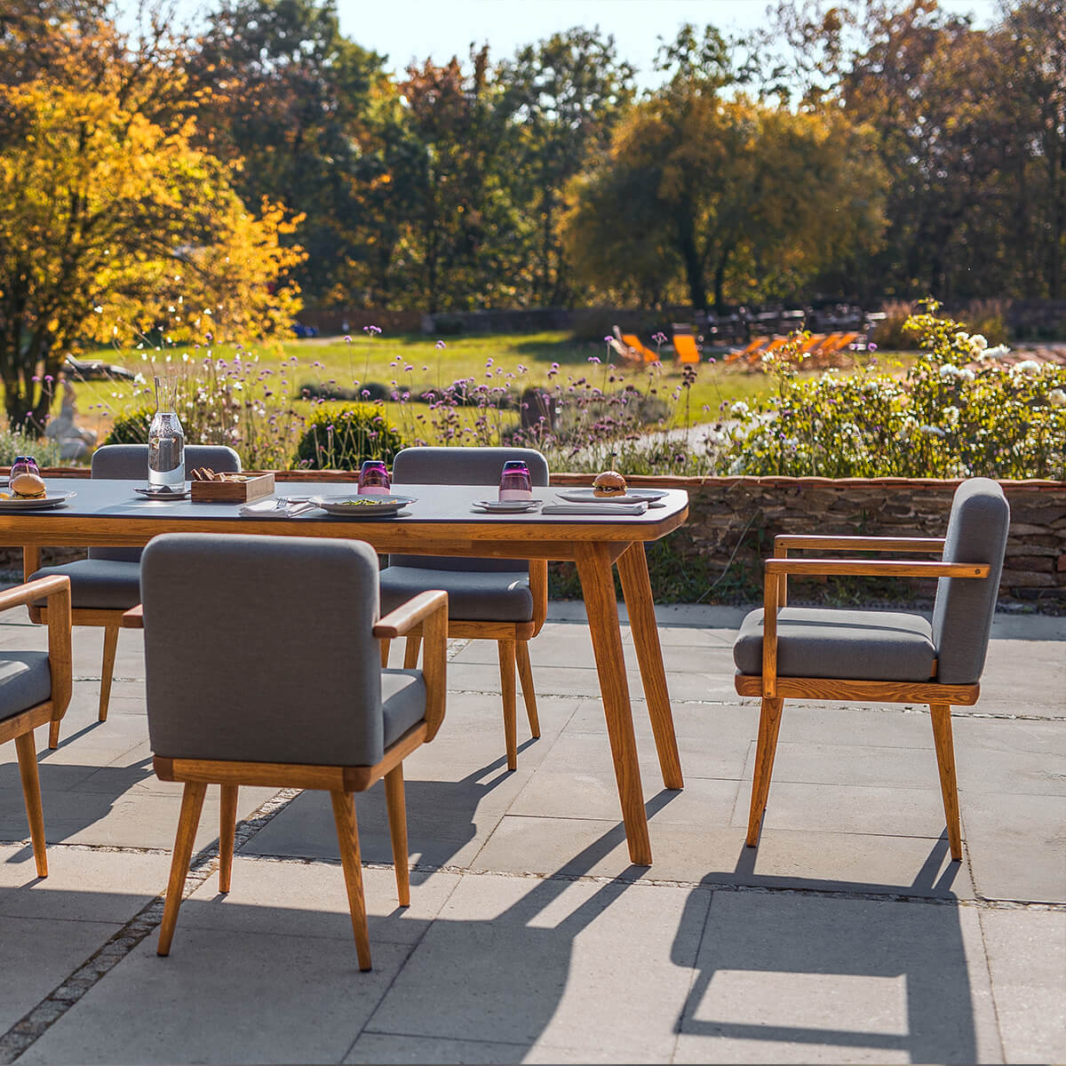 Madera de acacia negra engrasada con aceite natural específico; resistencia de primera clase a las inclemencias del tiempo.