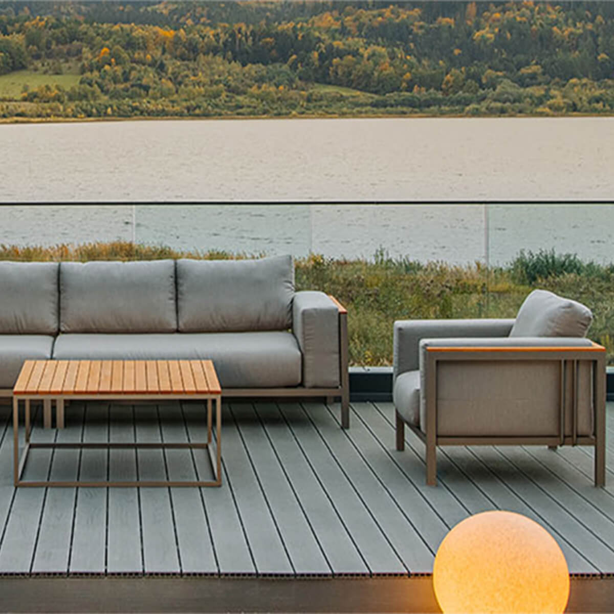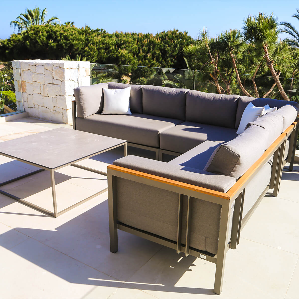 Armazón de aluminio, pintado al polvo con pintura de poliéster estructural. Se puede pedir con madera adicional en los pasamanos.