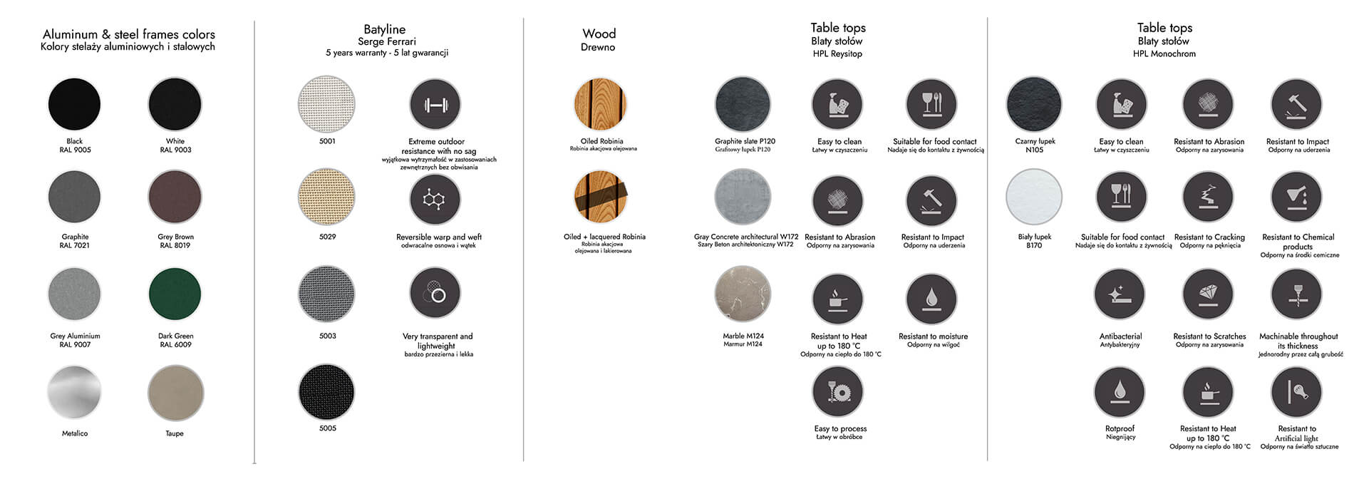 Tejidos Dralon: 100% acrílico, impermeable, temp. máx. 50°C, 2 años de garantía, no teñido en masa, capa antimanchas que facilita la limpieza, recubrimiento de teflón, alta resistencia a la intemperie, peso 180 g/m².