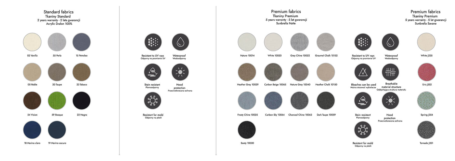 Tejidos Sunbrella: 100% acrílico, impermeable, resistente a las manchas, teñido en masa, resistente a los rayos UV, resistente al moho, transpirable, 5 años de garantía (pudrición, moho y solidez de los colores), máx. temperatura 70°C, peso 280g/m².