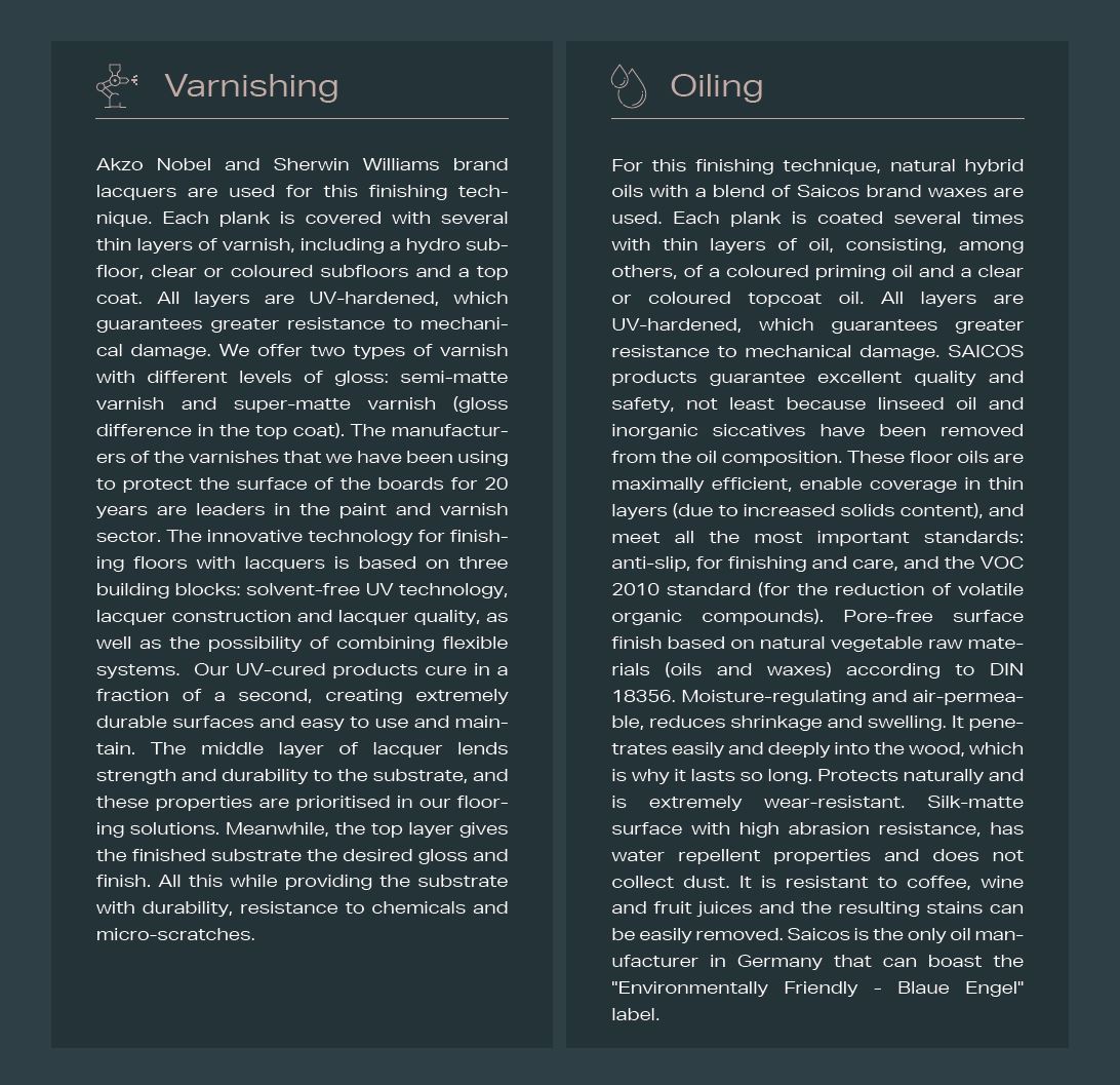 ProParquet es una solución a medida para el diseño de interiores moderno. El material de dos capas combina la durabilidad y elegancia de la madera noble de primera clase con la facilidad y rapidez de una instalación sin complicaciones. Es un suelo de madera de excelente calidad, que puede utilizar inmediatamente después de su instalación – cada pieza está protegida y acabada ya en la fase de producción. La capa superior de proParquet es un friso de roble noble de aproximadamente 4 mm, y la capa inferior es un subsuelo macizo de coníferas o caducifolias. El lacado múltiple o el aceitado híbrido, así como el endurecimiento UV de los elementos de madera, garantizan una mayor durabilidad y resistencia del suelo a los daños mecánicos, al tiempo que mantienen sus cualidades estéticas y de uso naturales. El fenómeno de proParquet es la posibilidad de uso seguro y eficaz en calefacción por suelo radiante.